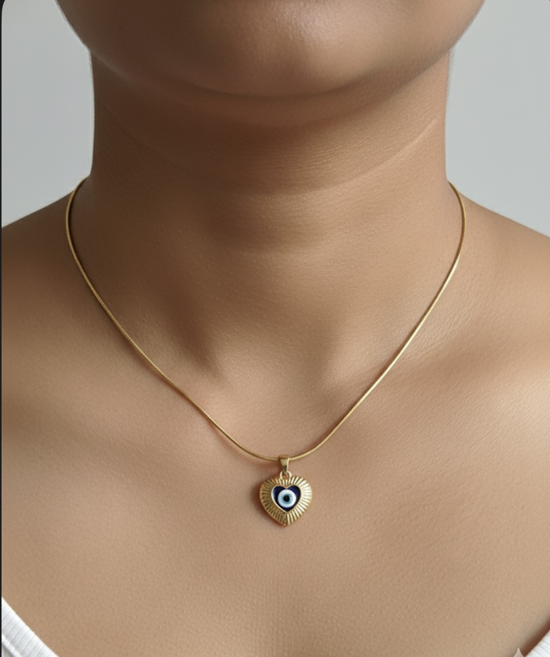 A delicate pendant featuring an evil eye in a heart, built on pure stainless steel and 18k gold coated. Certified skin safe, this necklace is also completely waterproof and reliably anti tarnish. The dainty style ensures you feel confidence for every occasion, from office looks to family brunch.