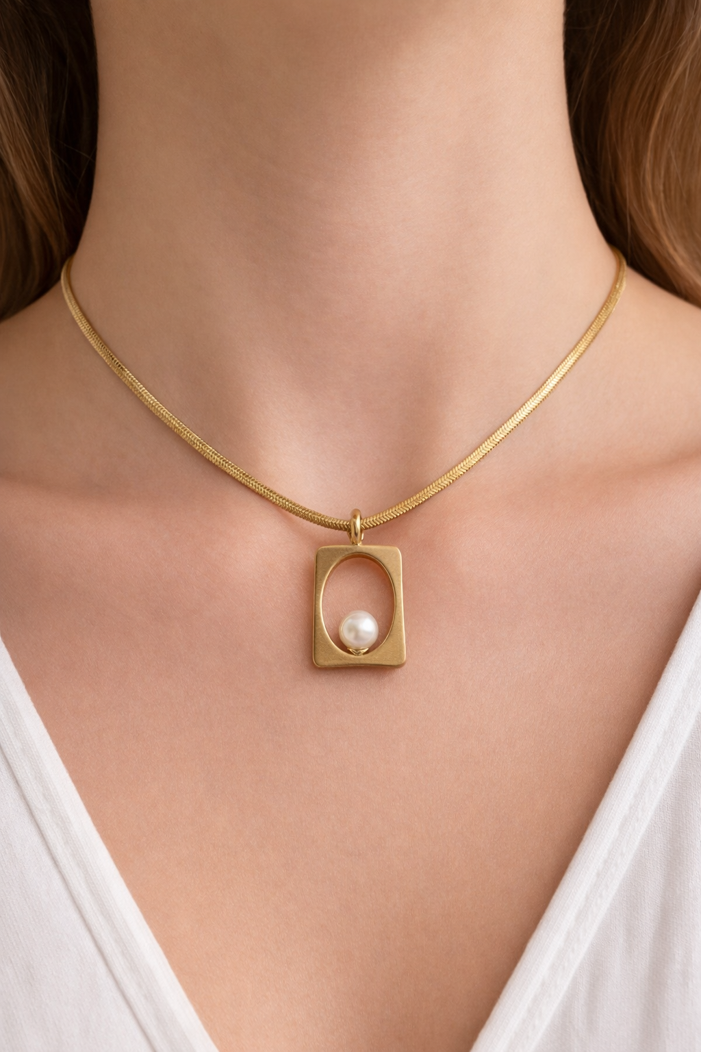 Classic pearl pendant framed in a modern gold silhouette. 18K gold coated, waterproof, anti-tarnish and sweat-proof—timeless and versatile.
